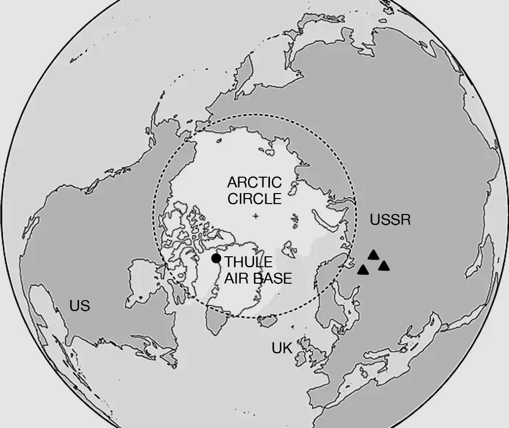 As the bulk of the Soviet Union’s arsenal of ICBMs were located close to Russia’s border with Eastern Europe, the majority of missiles forming an all-out attack on the United States during November of 1979, would have been launched from this location. The missile flight paths would have arched over the Arctic Circle making their way to a multitude of military targets and large population centres on the North American continent.