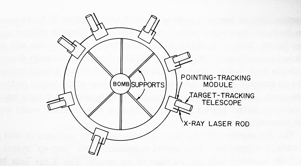Excalibur consisted of a small nuclear bomb that was surrounded by a framework of expendable X-Ray laser rods and tracking modules that could each be separately aimed. During a Soviet ICBM attack, the orbiting system was designed to track and target each incoming missile. After a maximum amount of targets were acquired it would detonate itself sending X-Ray laser beams through the rods that would theoretically destroy the Soviet missiles thousands of miles away.